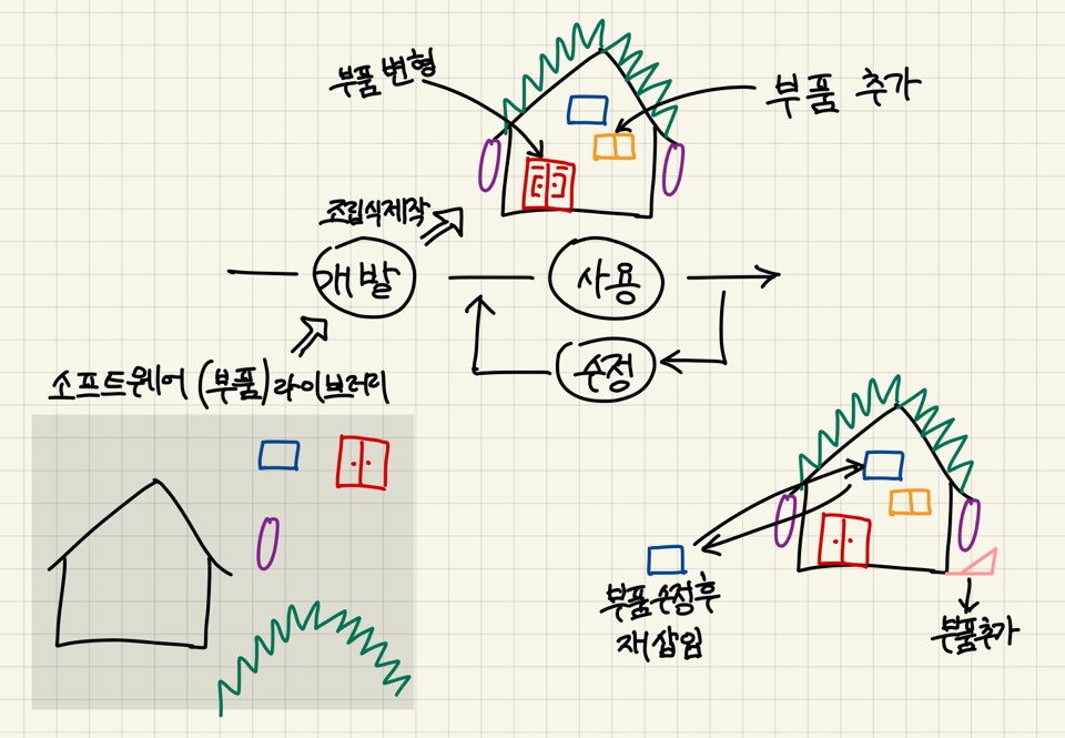 소프트웨어 제작을 집짓는것에 비유해보겠습니다. 설명을 위해 개별적인 소프트웨어를 부품이라고 칭하겠습니다.