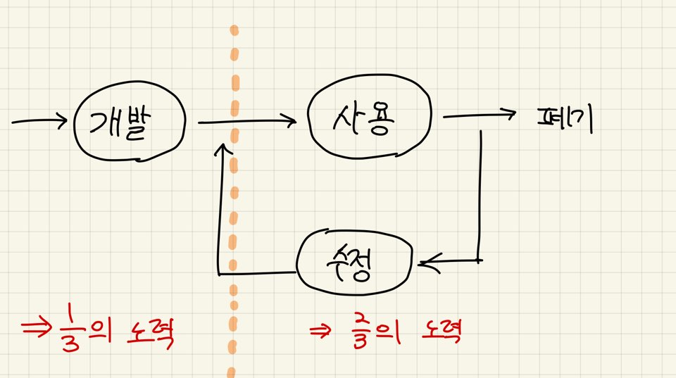 하나의 소프트웨어가 개발되어 관리되다 일생을 마칠 때까지 드는 전체 노력을 1로 본다면, 개발 작업에 1/3, 수정작업에 2/3의 노력이 배분됩니다. 물론 전체 노력의 1/3이 개발 시 단기간에 집중적으로 필요하지만, 한 소프트웨어의 수명을 5년 정도라고 볼 때 이 기간동안 수정작업에 드는 2/3의 노력을 줄이는 것이 소프트웨어 회사 입장에서는 무엇보다 중요하다고 할 수 있죠.