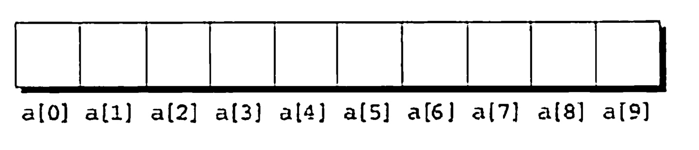 배열의 특정 원소에 접근하기 위해서는, 우리는 배열 이름 뒤에 중괄호로 둘러싸인 정수값을 적으면 된다. 이는 subscripting 혹은 indexing the array 이라고 불린다.) 배열의 원소들은 항상 0부터 자리매김된다. 따라서 배열의 길이가 n 인 원소들은 0 부터 n-1 까지 인덱싱된다. 예를 들어, 만약 a가 10개의 원소를 가졌다면, 그들은 다음 그림처럼 각각 a[0], a[1], a[2], .... , a[9] 로 지정된다.