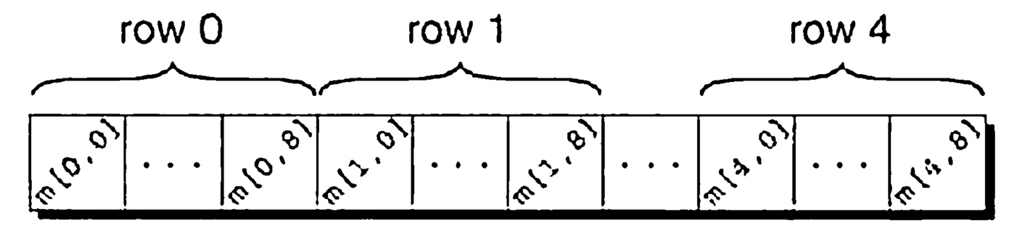 C는 배열을 행 우선순위에 의해 저장한다.(C stores arrays in row-major order) 0번째 행이 먼저오고 그 다음 1번째 행, 2번째 행으로 계속된다. 예를들면, 이차원 배열 m은 다음 그림과 같이 저장된다.