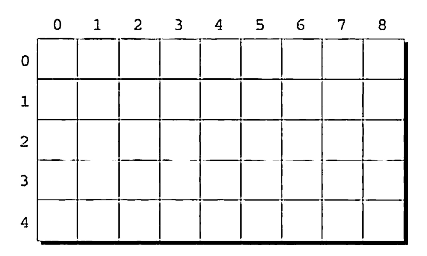배열은 5개의 행과 9개의 열을 가지고 있다. 다음 그림처럼 행과 열 모두 0부터 인덱싱된다.