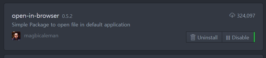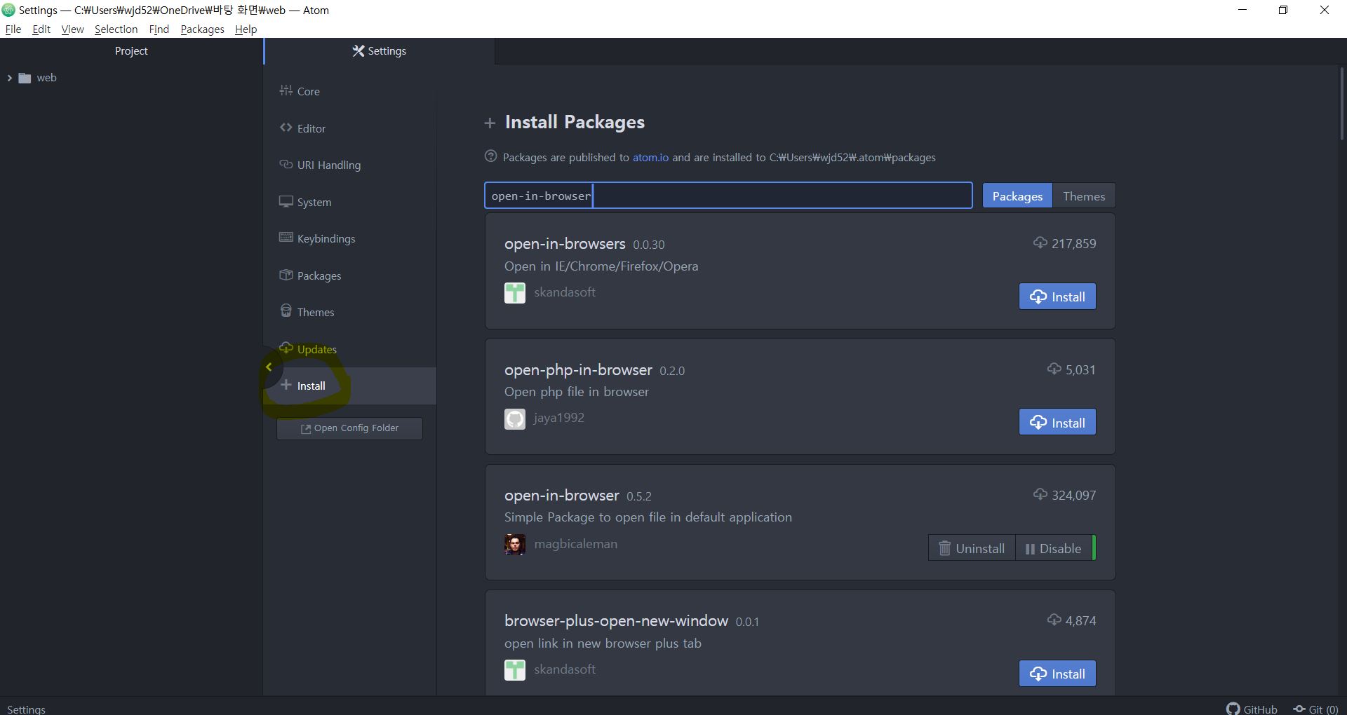 맨 위쪽 좌측에 위치한 File 메뉴로 들어가서, Settings 로 들어갑니다. 그 후 아래사진에 형광펜으로 표시해놓은것처럼 Install 로 들어갑니다. 그런다음 아래그림처럼 검색창에 open-in-browser 라고 칩니다.